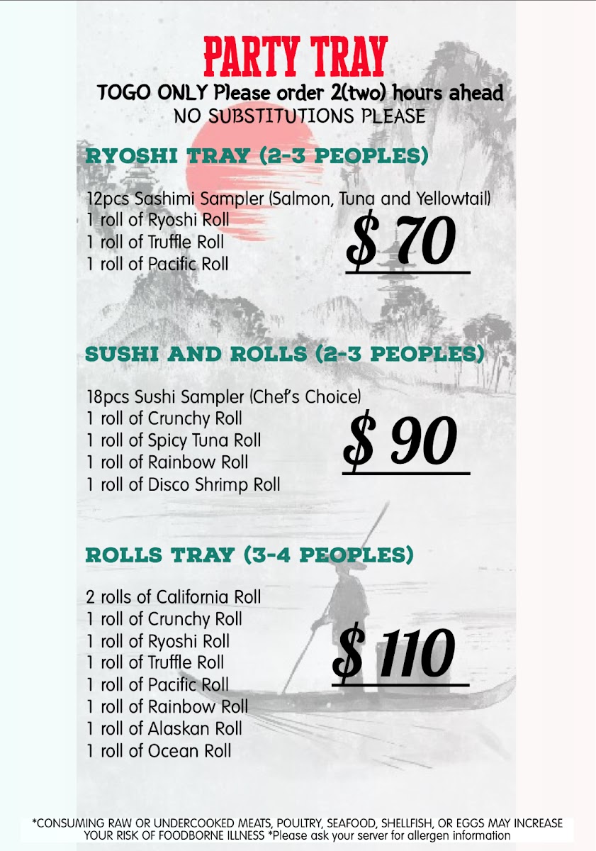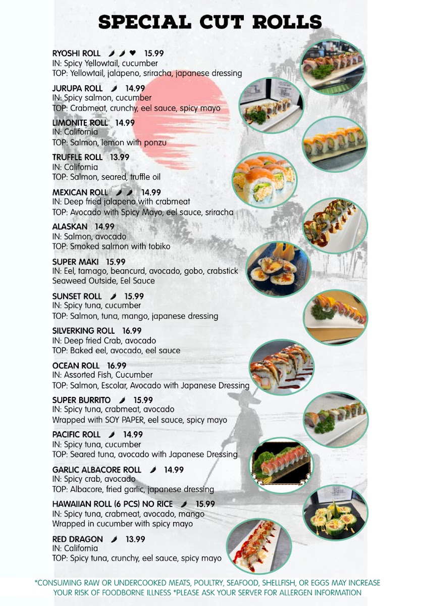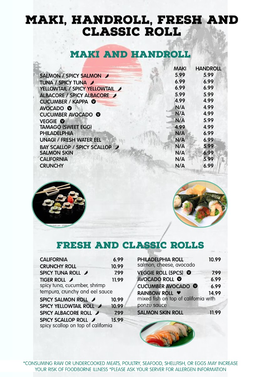 Medium. In: spicy yellowtail, cucumber. Top: yellowtail, jalapeño, sriracha.