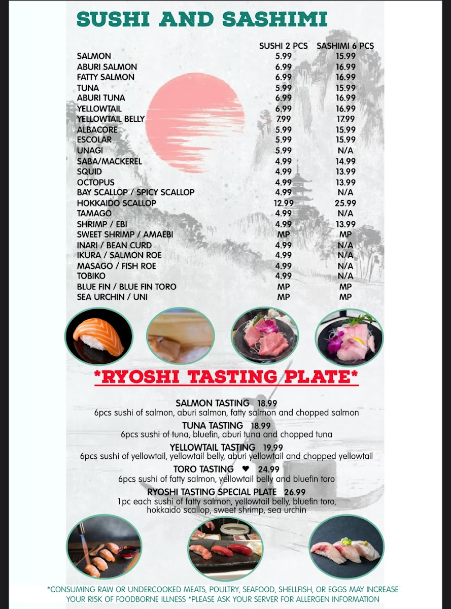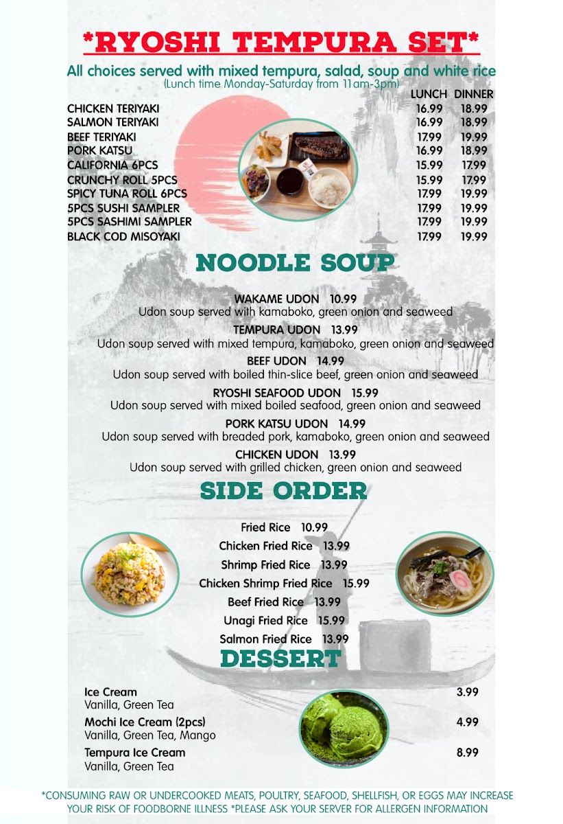 The Ryoshi Tempura Set is perfect for those who want a full meal with options like O-Dinner-5pc Sashimi Sampler or O-Dinner-Chicken Teriyaki, ideal for those craving both tempura and a sushi experience in one.